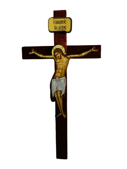 Cruce de perete cu Iisus Răstignit – 20x10x1 cm.Cruce de perete din lemn cu Iisus Răstignit – dimensiuni 20x10x1 cm, realizată în stil ortodox bizantin. Reprezintă Răstignirea Domnului cu detalii pictate atent, inclusiv inscripția în greacă „Ο ΒΑΣΙΛΕΥΣ ΤΗΣ ΔΟΞΗΣ” („Împăratul Slavei”). Ideală pentru spațiul de rugăciune, casa creștinului sau ca dar religios cu valoare spirituală. Un simbol al credinței și al jertfei Mântuitorului, potrivit pentru agățat pe perete.