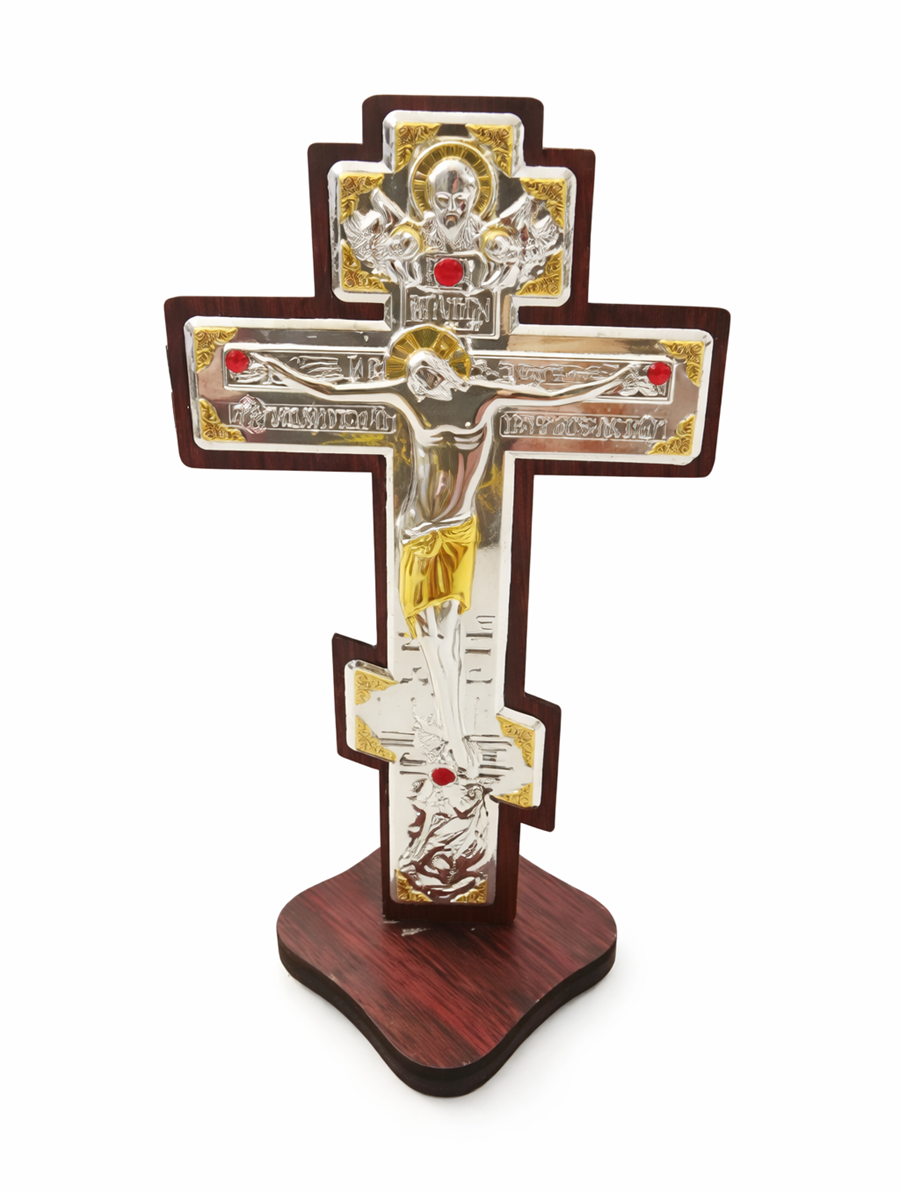 Această cruce ortodoxă de masă este un simbol al credinței, protecției divine și al jertfei lui Hristos, potrivită pentru orice locuință creștină.