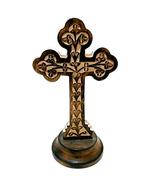 Cruce pentru masă realizată din lemn alb, cu sculptură trilobată florală deosebită și bază rotundă stabilă. Are o înălțime de 19 cm și o lățime de 10 cm, fiind ideală pentru altarul de acasă, birou sau colțul de rugăciune. Designul elegant și detaliile fine o fac un obiect decorativ religios potrivit atât pentru uz personal, cât și pentru a fi oferită cadou cu ocazia sărbătorilor, onomasticilor sau altor evenimente speciale. Un simbol al credinței și protecției, perfect integrat în orice ambient ortodox.