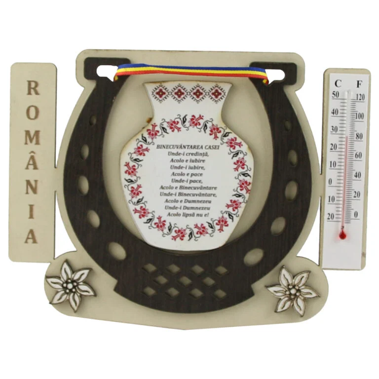 Potcoavă din lemn cu termometru și mini-vază imprimată cu mesajul „Binecuvântarea Casei” – simbol al norocului și protecției în gospodărie. Realizată cu motive tradiționale românești, această decorațiune de perete (19×14.5 cm) este ideală pentru cadouri de casă nouă, suveniruri românești sau decor rustic. Include termometru funcțional în grade Celsius și Fahrenheit și panglică tricoloră. Fabricată cu atenție la detalii – aduce un plus de autenticitate și spiritualitate oricărui cămin. Perfectă pentru iubitorii de tradiții și simboluri românești.