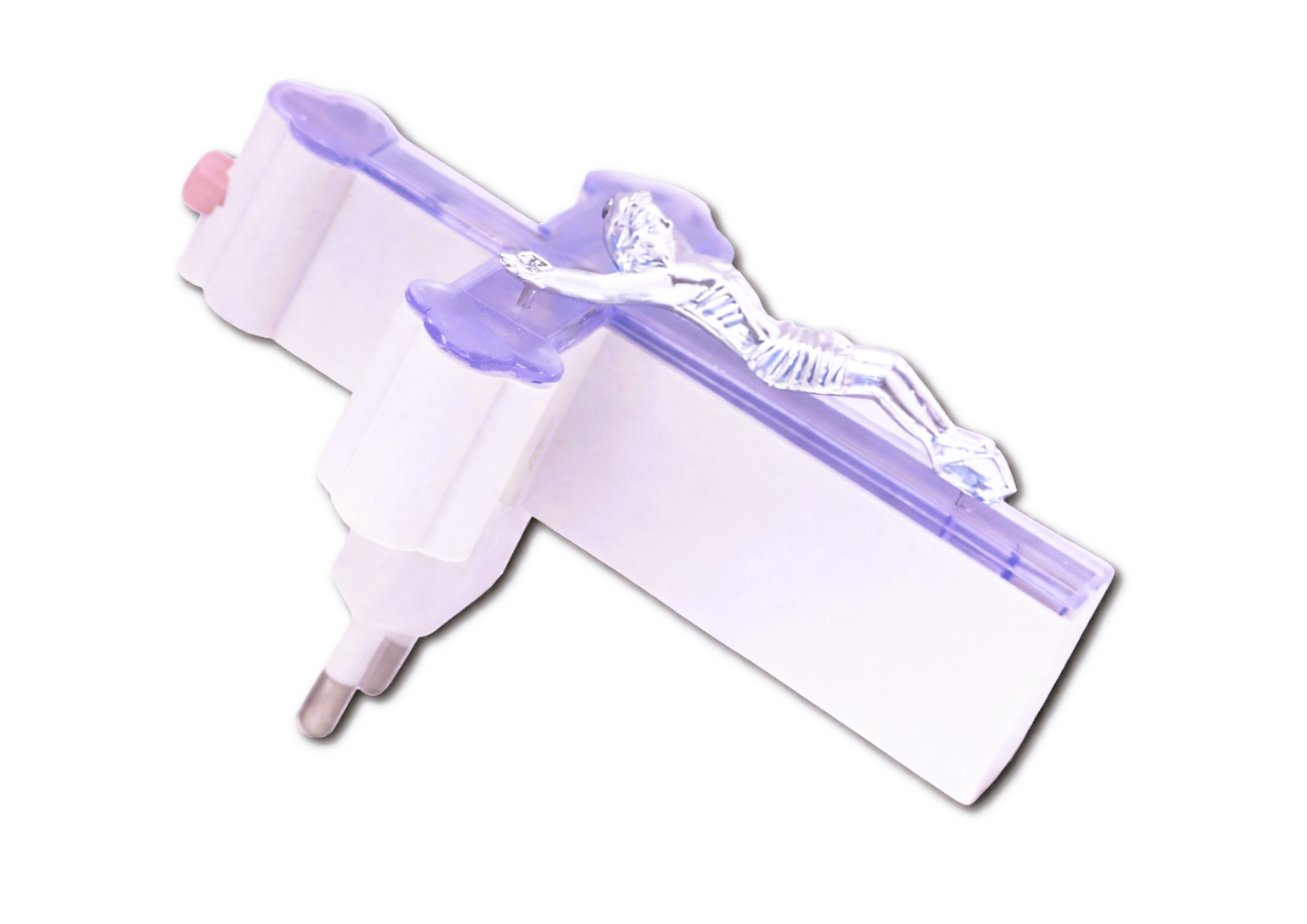 Cruce lampă de veghe LED albastră, cu întrerupător și alimentare la priză, ideală pentru iluminat ambiental și protecție spirituală în orice locuință.